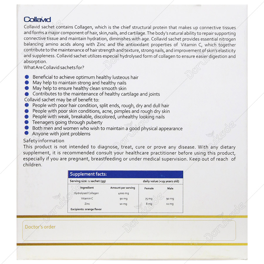 ساشه کلاوید با دارا بودن کلاژن هیدرولیز شده که مستقیما از پوست ماهی گرفته شده و همچنین ویتامین C و زینک به سلامت پوست ، مو ، ناخن ، مفاصل و استخوان ها کمک موثری می کند.