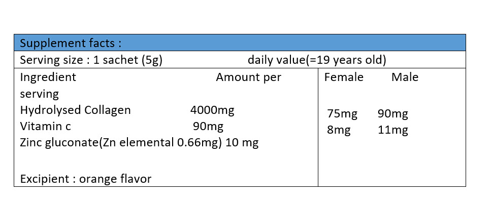 کلاژن هیدرولیز شده 4000 میلی گرم ویتامین سی 90 میلی گرم زینک گلوکونات(روی المنتال 0.66 میلی گرم) 10 میلی گرم طمع دهنده پرتقالی 900 میلی گرم |
